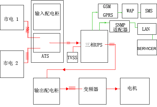 對鋼鐵企業(yè)信息中心,推薦采用UPS的雙回路冗余供電系統(tǒng),具有高度容錯的能力,可以杜絕單點(diǎn)故障隱患。恩億梯UPS雙回路冗余供電系統(tǒng),采用2臺三進(jìn)三出大功率UPS組成1+1并聯(lián)冗余系統(tǒng)輸出,作為負(fù)載設(shè)備的主電源輸入,1路市電(也可以是另一路UPS)作為負(fù)載設(shè)備的備用電源輸入。對于雙電源負(fù)載設(shè)備,可以直接接入二路輸入,分別來自UPS并機(jī)系統(tǒng)和市電回路,提高供電保障;對于單電源負(fù)載設(shè)備,在其前端配置冗余開關(guān),利用冗余開關(guān)的冗余配電功能提高供電可靠性——冗余開關(guān)具有二個輸入端子,一個輸出端子,只要保證有一路輸入,輸出就不會中斷。此種應(yīng)用,當(dāng)主回路供電系統(tǒng)供電中斷時,負(fù)載設(shè)備切換至由備用電源回路供電;從而大大提高了負(fù)載設(shè)備的供電可靠性,全面保護(hù)整個鋼鐵企業(yè)信息中心的的各種硬件設(shè)備、運(yùn)行程序和數(shù)據(jù)及數(shù)據(jù)的傳輸。