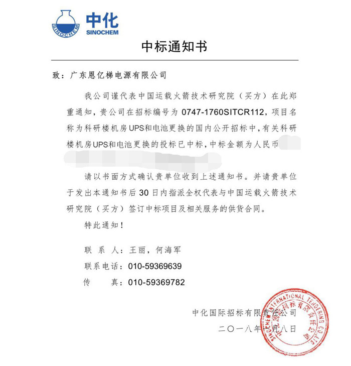 中國運載火箭技術研究院作為我國首屈一指的國防科研單位,其設備采購及供應商選擇都有著嚴格的標準,不僅要求競標企業提供的產品符合其特定的技術規范,還需對競標企業品牌、價格、服務、信譽等方面進行全方位的評審,經過國內多家電源廠商的激烈角逐,最終確認恩億梯成功中標,目前公司已收到中標通知書。